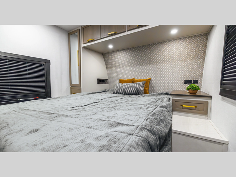 Each model is built with laminated "Aluma Frame" sidewalls and floor with block foam insulation for added durability. There is a power tongue jack with an LED docking light, along with an outside shower, and an extra large pass-thru storage for camp gear. You'll also enjoy the included Elevated Value Package that features conveniences such as square windows with built-in shades, 60K BTU On-Demand tankless water heater, and Maxxis radial tires.
