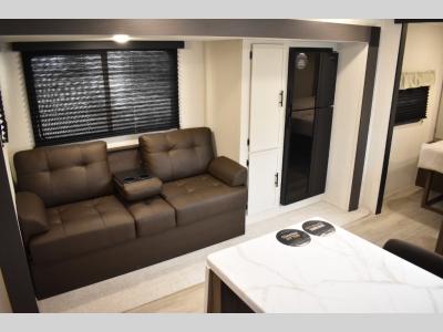 Each model is constructed with a fully enclosed underbelly, a PVC roof membrane, and gold reflective exterior windows that are sure to be eye-catching. The power tongue jack and power stabilizer jacks will have you set up in no-time, and the best-in-class drop frame pass-through storage means you can bring along extra camp gear. Inside, you'll find Congoleum flooring, seamless pressed countertops, a designer bedding package, and many more comforts.